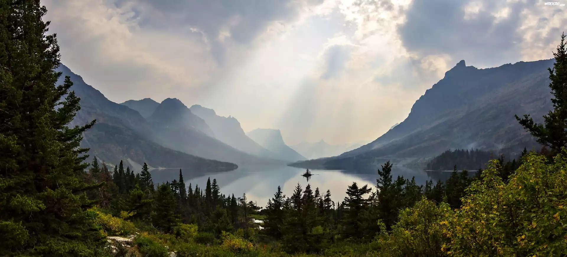 Góry, Lasy, Jezioro, Świt, Wschód Słońca, Panorama