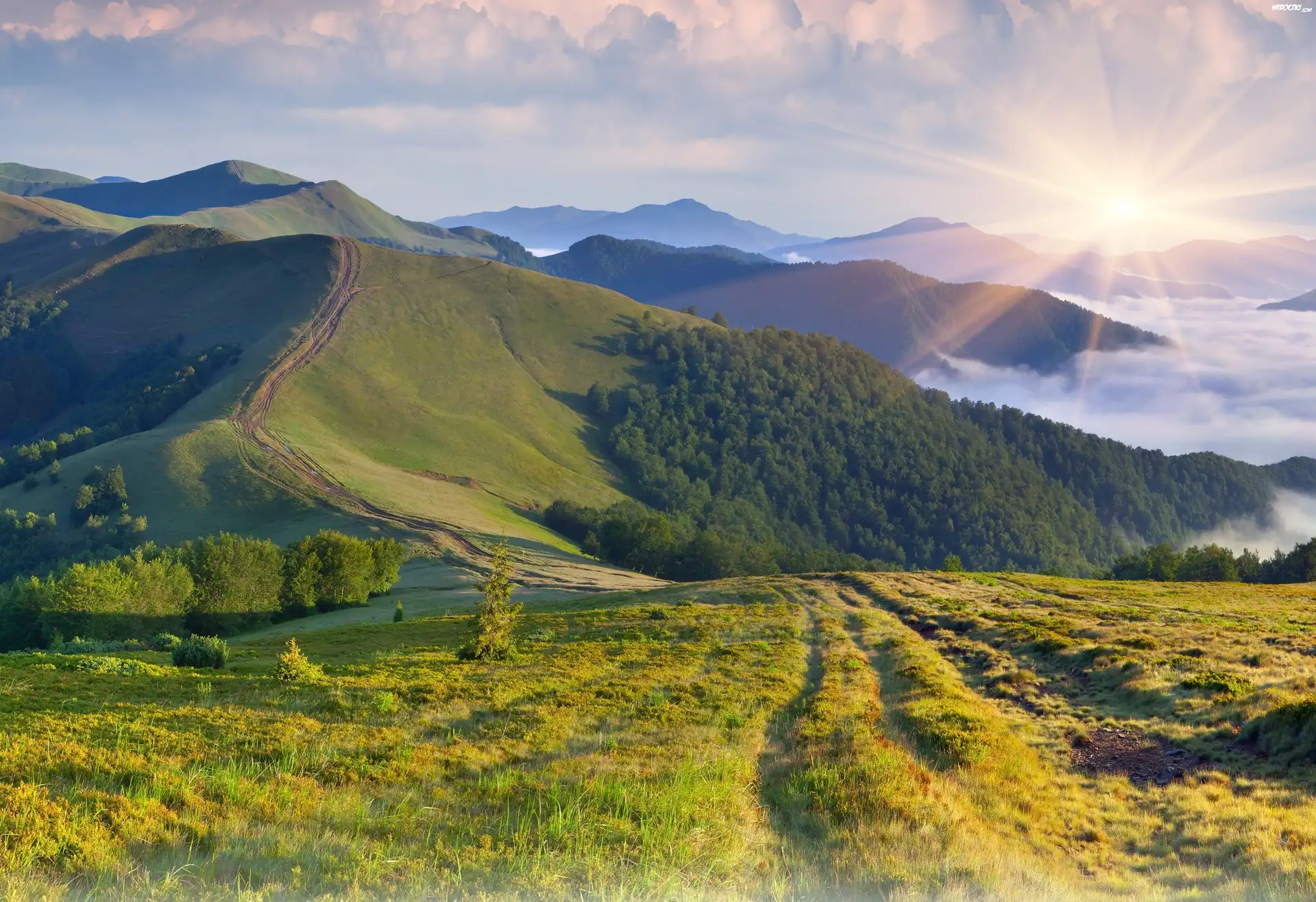 Góry, Lasy, Łąki, Chmury, Mgła, Promienie, Słońca