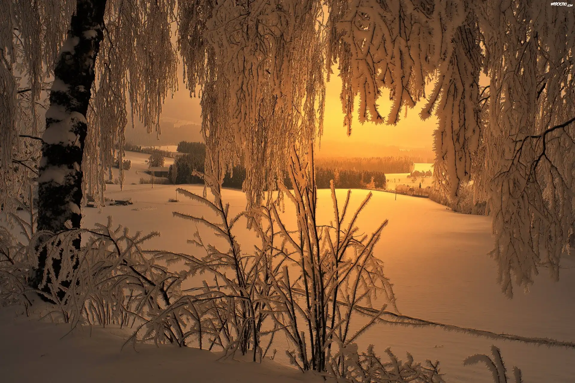 Góry, Lasy, Farmy, Pola, Wschód, Słońca, Zima