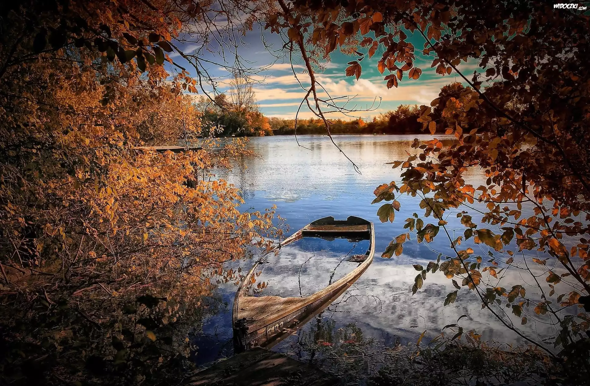 Zdjęcia, Łódka, Jezioro, Drzewa, Lasy, Jesień