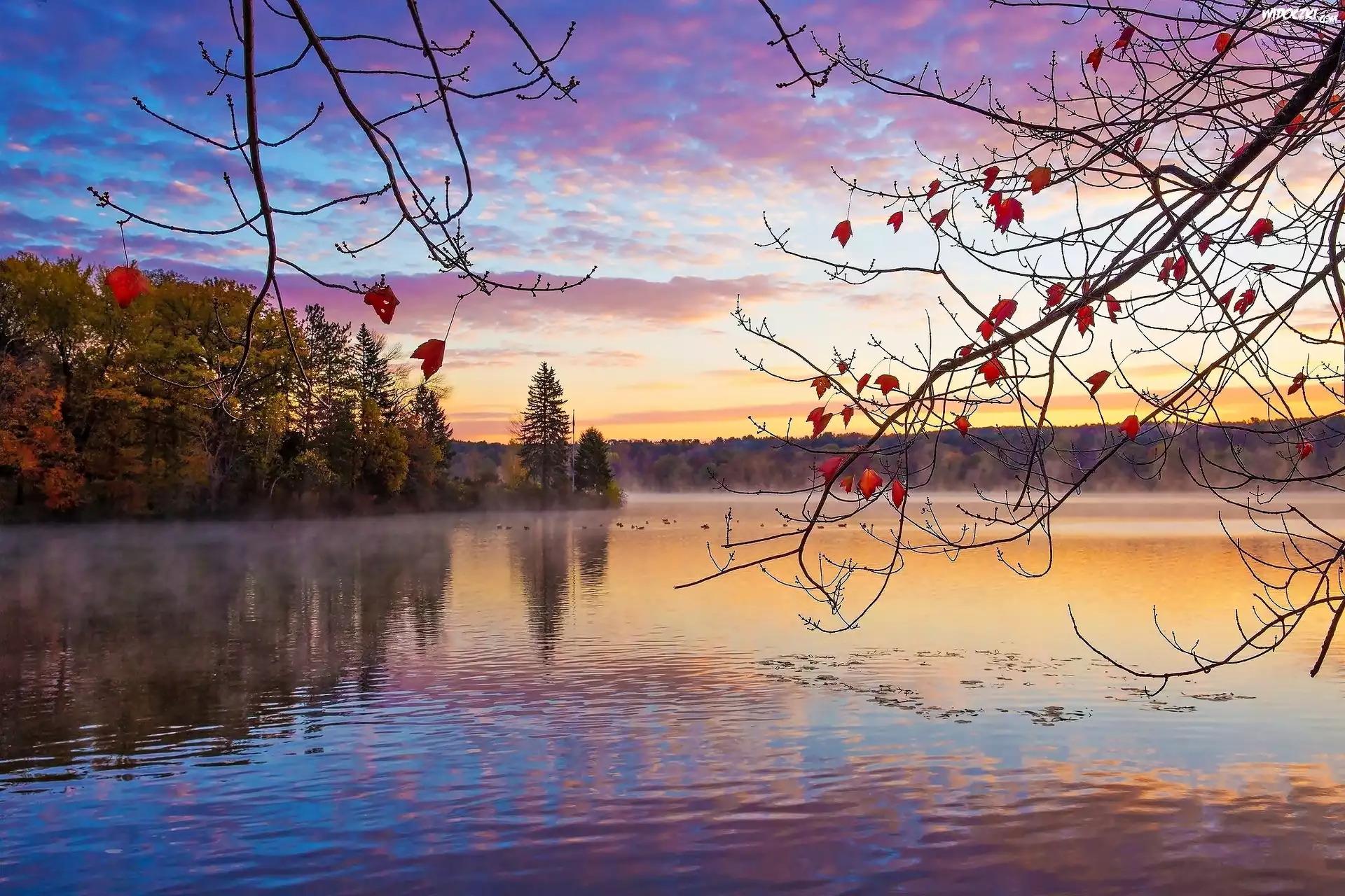 Jezioro, Lasy, Mgła, Kaczki, Wschód, Słońca, Jesień