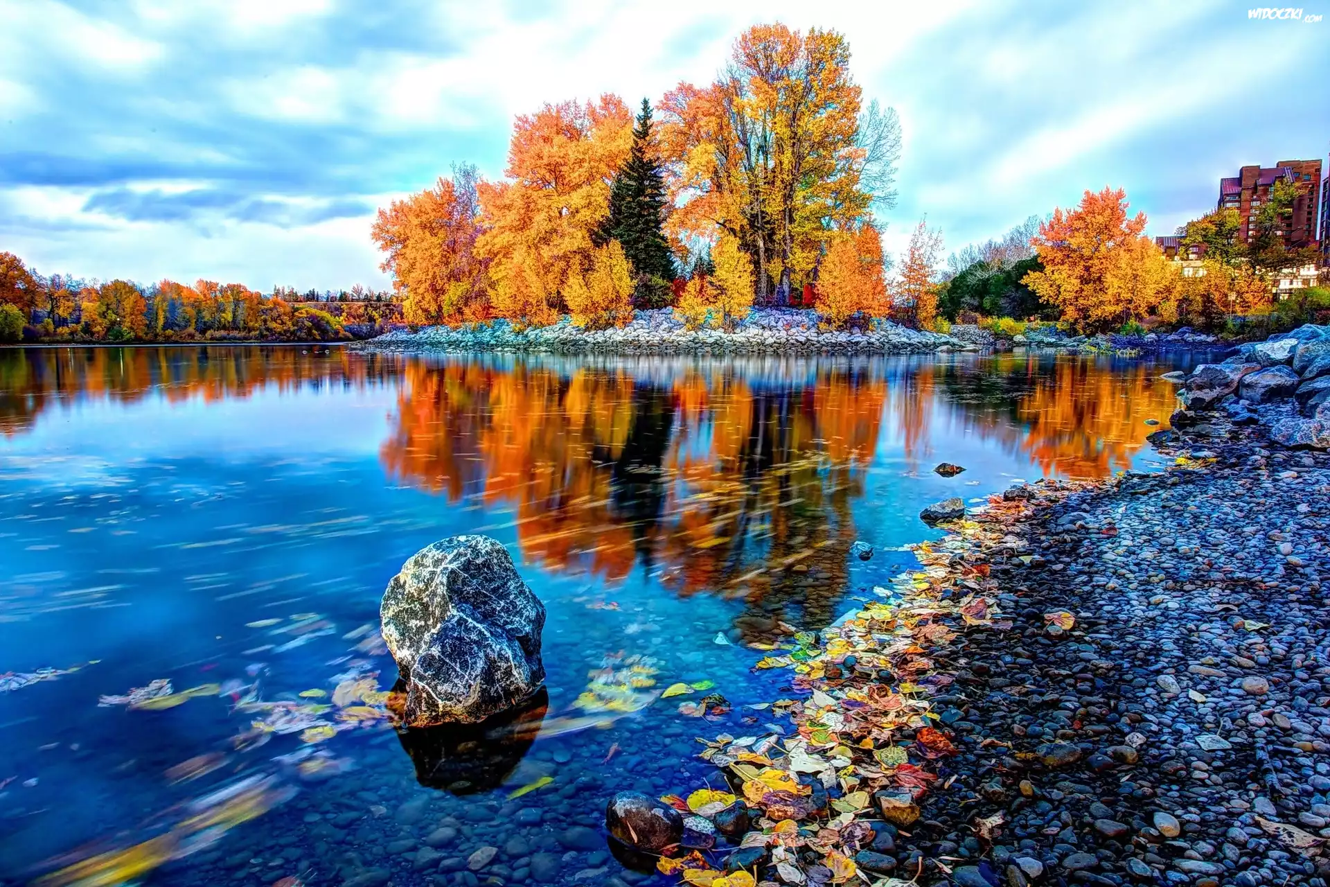 Zdjęcia, Rzeka, Lasy, Kamienie, Liście, Jesień, Prowincja, Alberta, Kanada