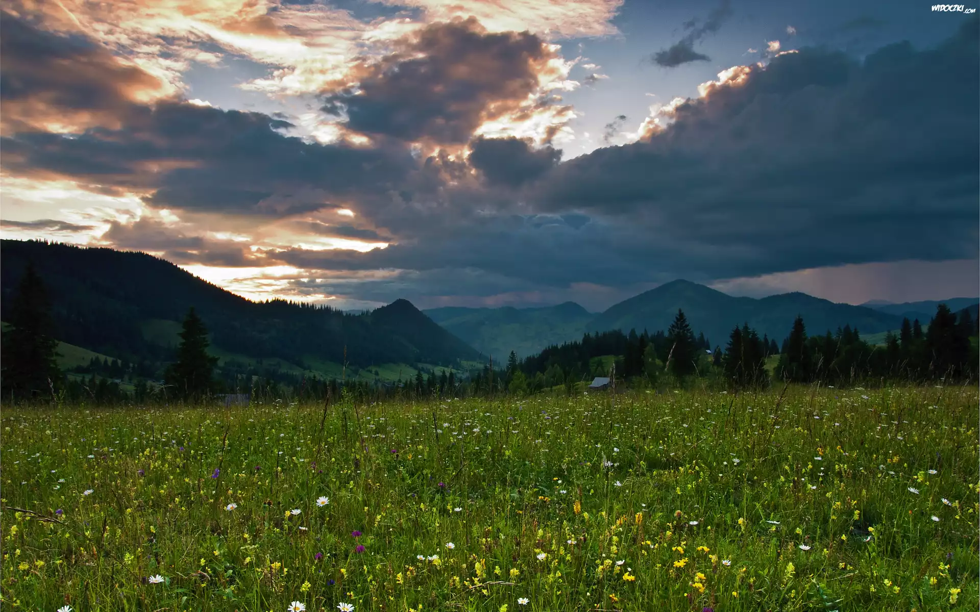 Łąka, Kwiaty, Góry, Lasy, Chmury