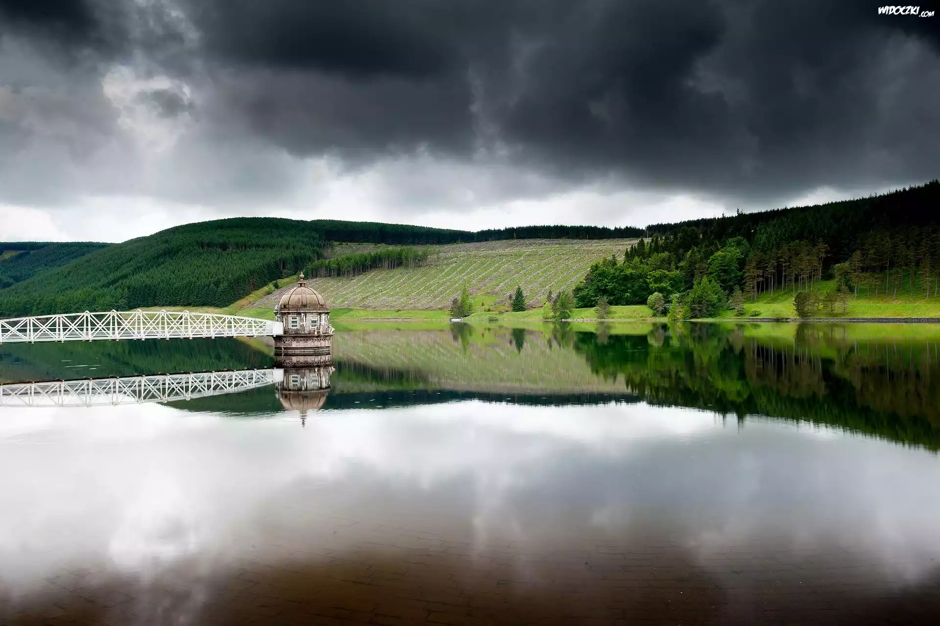 Lasy, Jezioro, Molo, Chmury