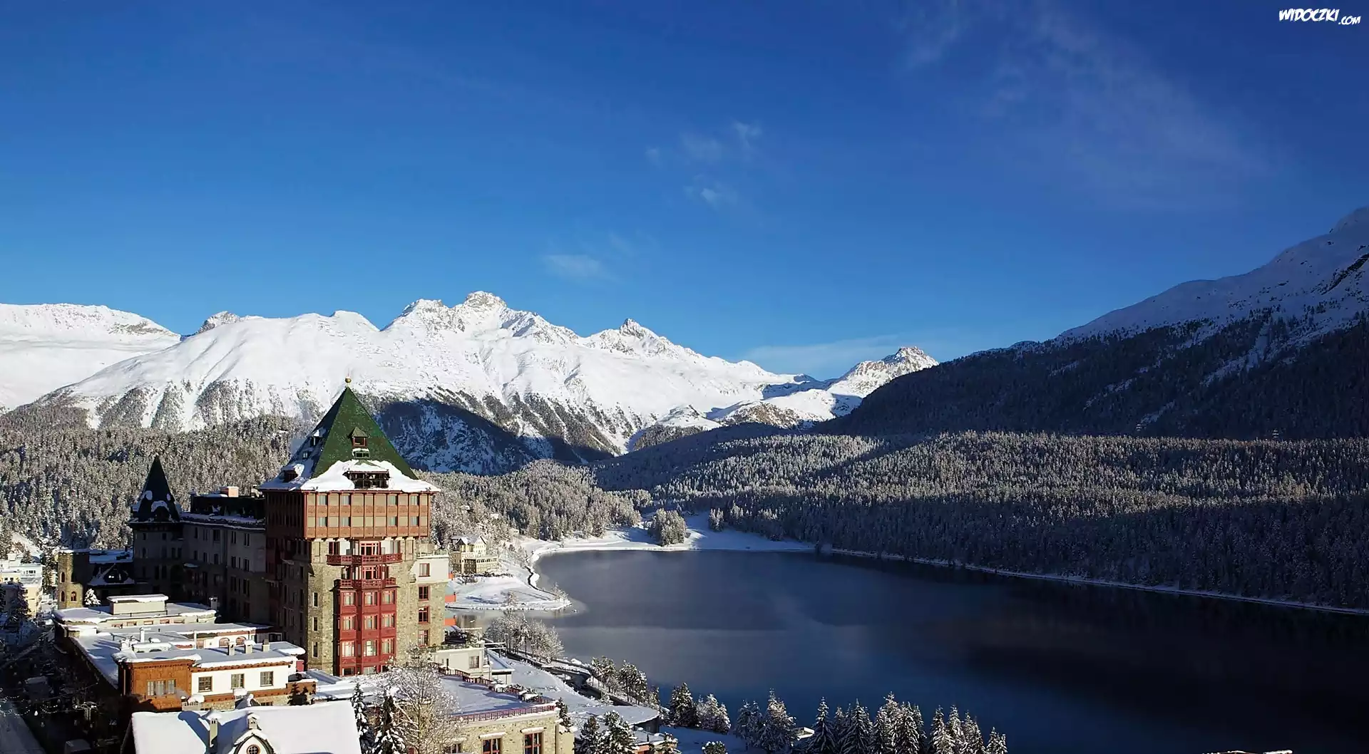 Zdjęcia, Góry, Lasy, Jezioro, Hotel, Badrutts Palace, St.Moritz