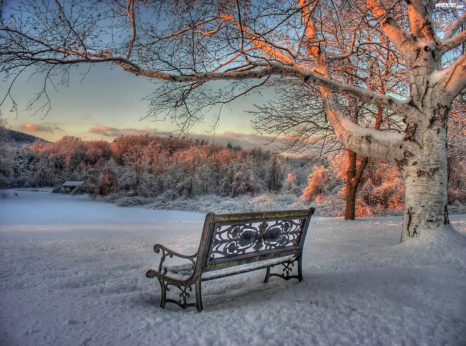 Zdjęcia, Lasy, Ławka, Śnieg, Zima