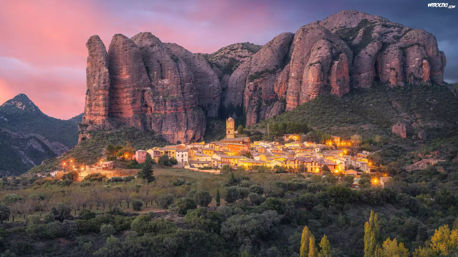 Góry, Mallos de Riglos, Skały, Domy, Wzgórze, Drzewa, Lasy, Chmury, Zachód słońca, Aguero, Hiszpania |