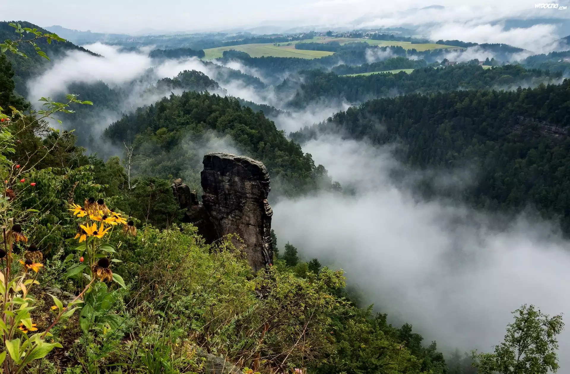 Zdjęcia, Wzgórza, Lasy, Mgła, Skały, Żółte, Kwiaty, Rośliny