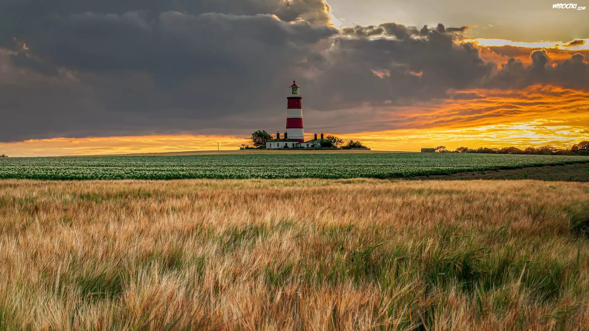Zdj臋cia, Latarnia morska, Happisburgh Lighthouse, Pole, Niebo, Chmury, Norfolk, Anglia