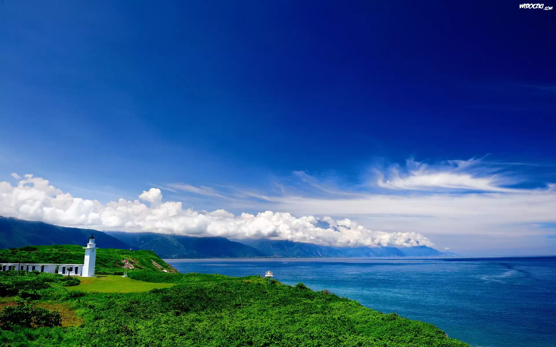 Latarnia, Morska, Wybrzeże, Góry, Chmury