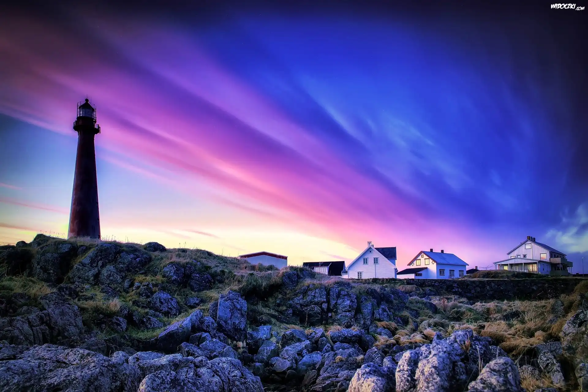 Zdjęcia, Latarnia, Morska, Domy, Skały, Kolorowe, Niebo