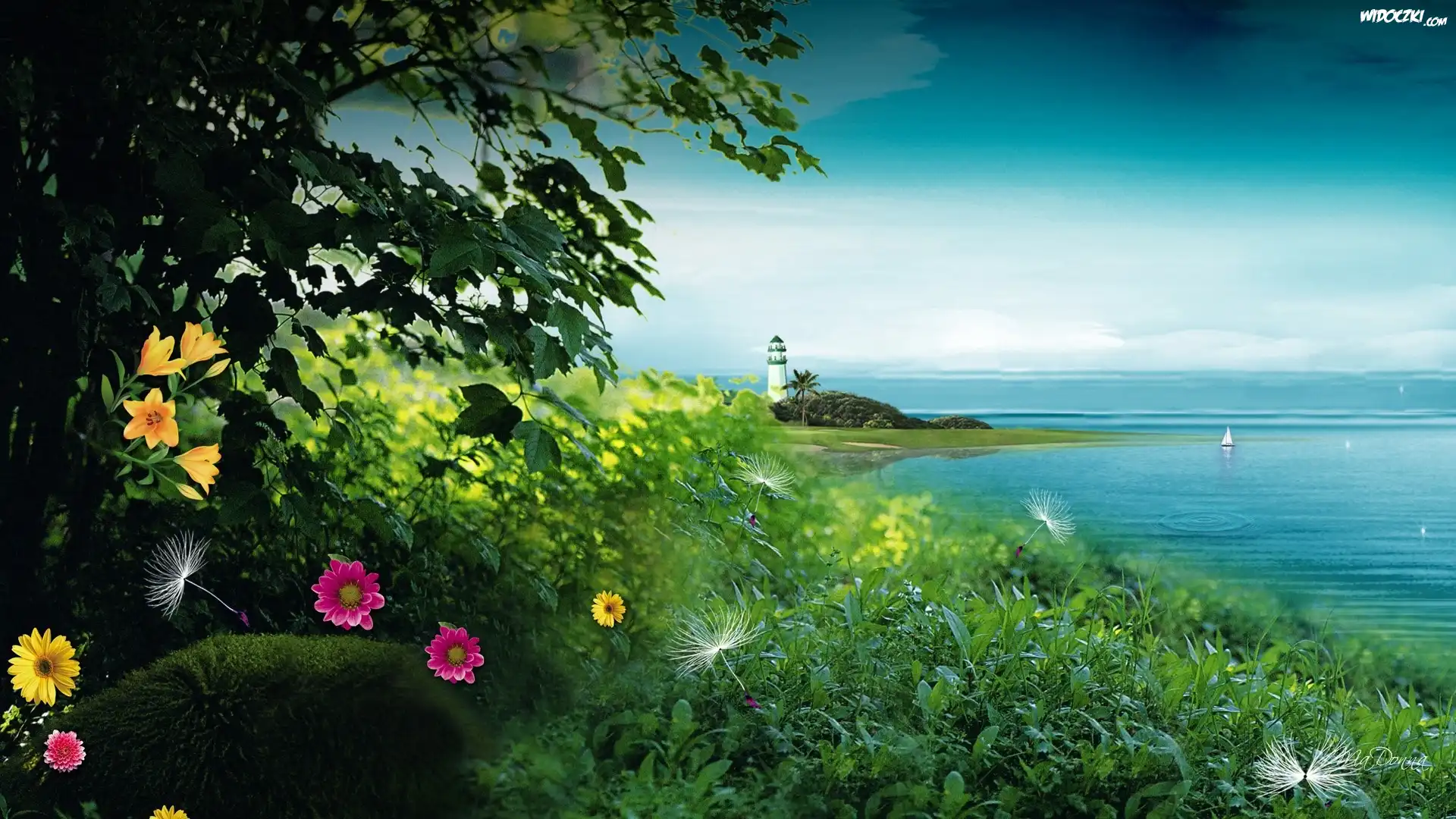 Zdjęcia, Latarnia Morska, Morze, Kwiatki, Roślinność
