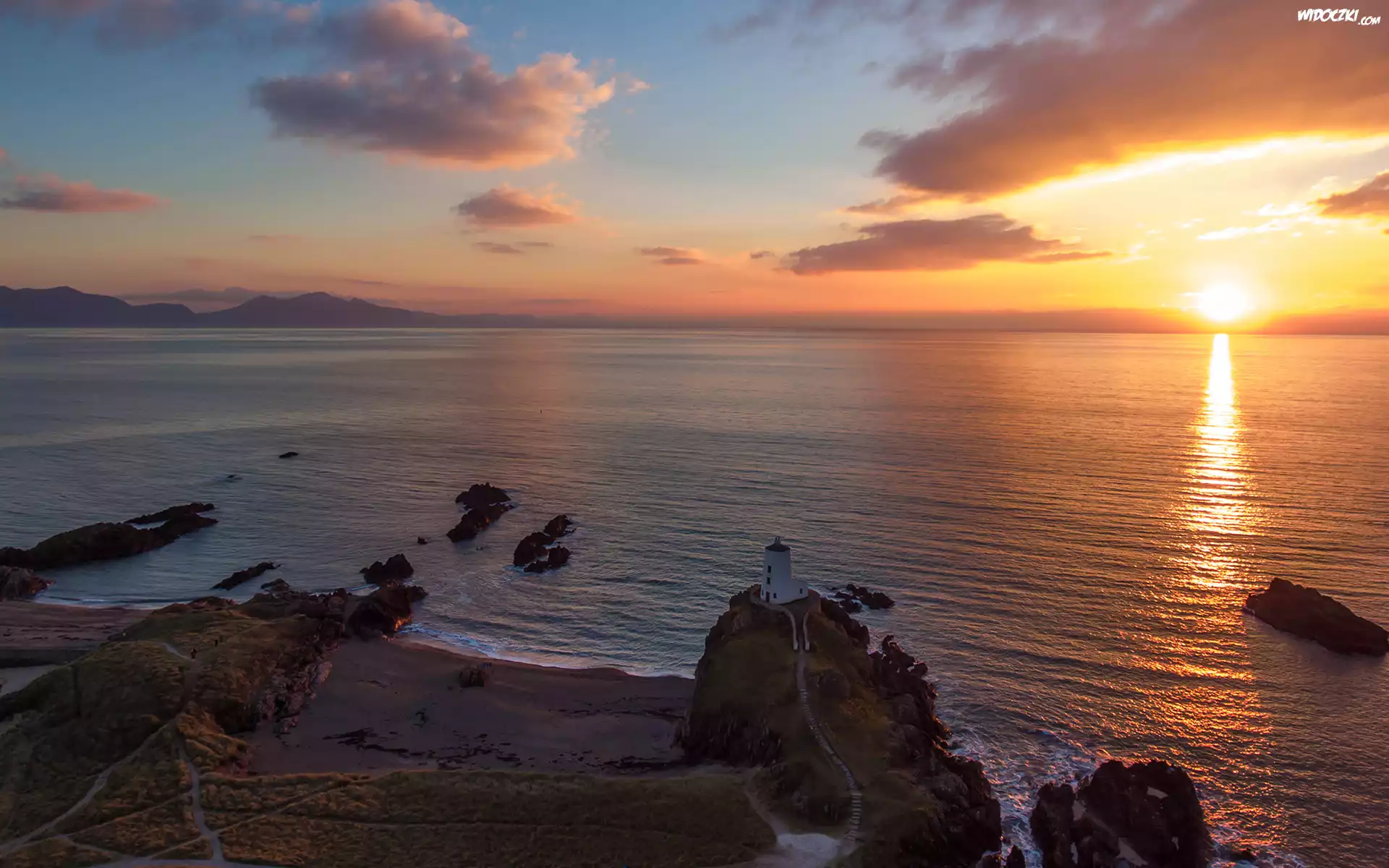 Zdjęcia, Morze, Latarnia morska, Zachód słońca, Skały, Chmury