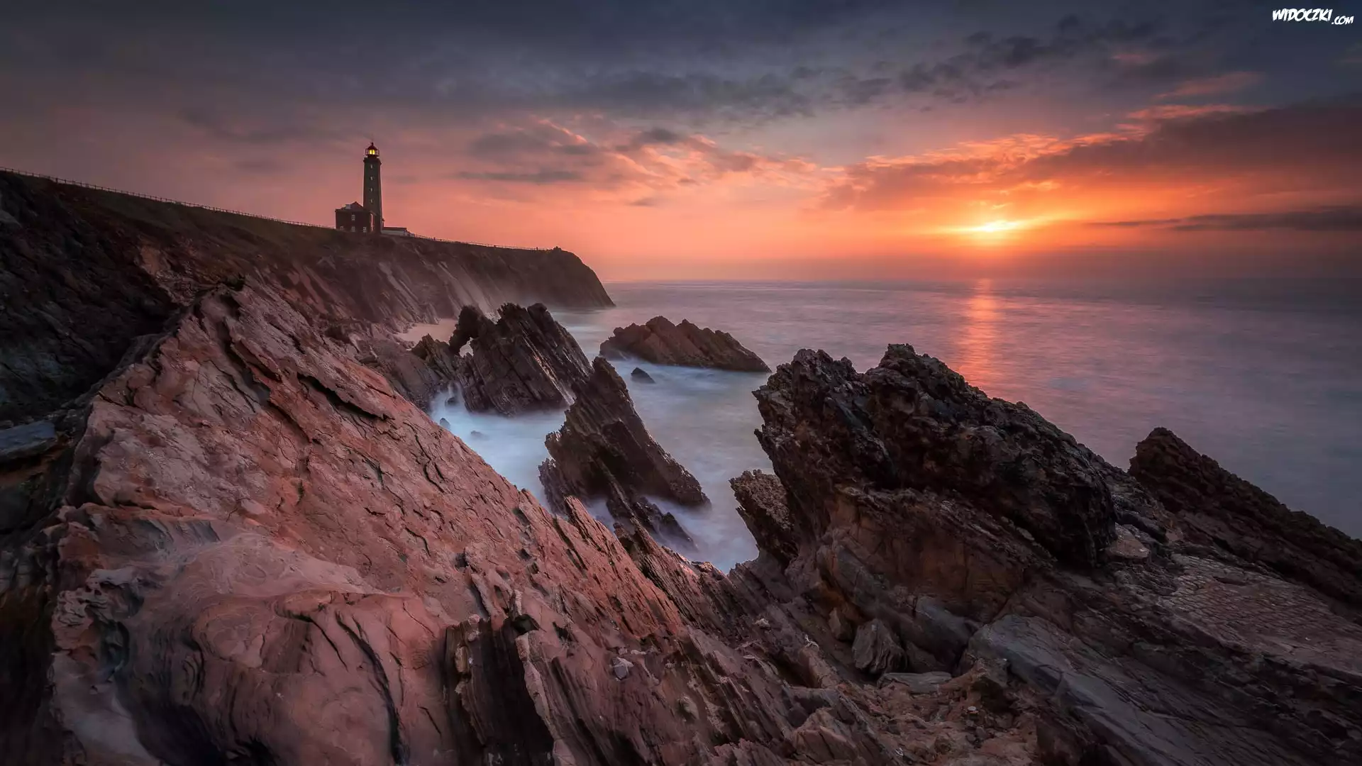 Zdjęcia, Morze, Latarnia morska, Skały Zachód słońca, Chmury