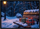 Zima, Noc, Park, Ośnieżone, Drzewa, Ławka, Prezenty, Latarnia