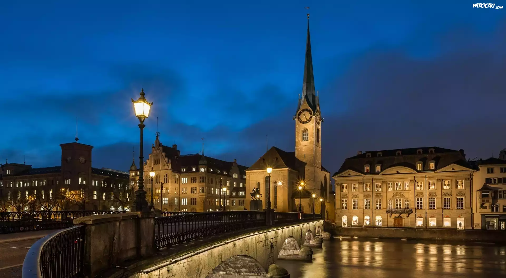 Zdjęcia, Szwajcaria, Zurych, Rzeka Limmat, Most Munsterbrucke, Kościół Fraumunster, Latarnia