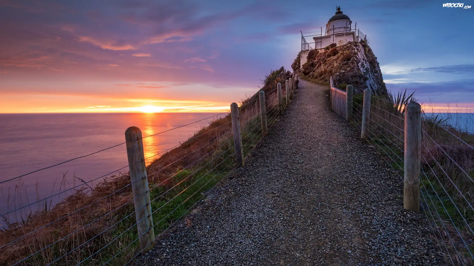 Zdjęcia, Latarnia, Droga, Zachód słońca, Morze