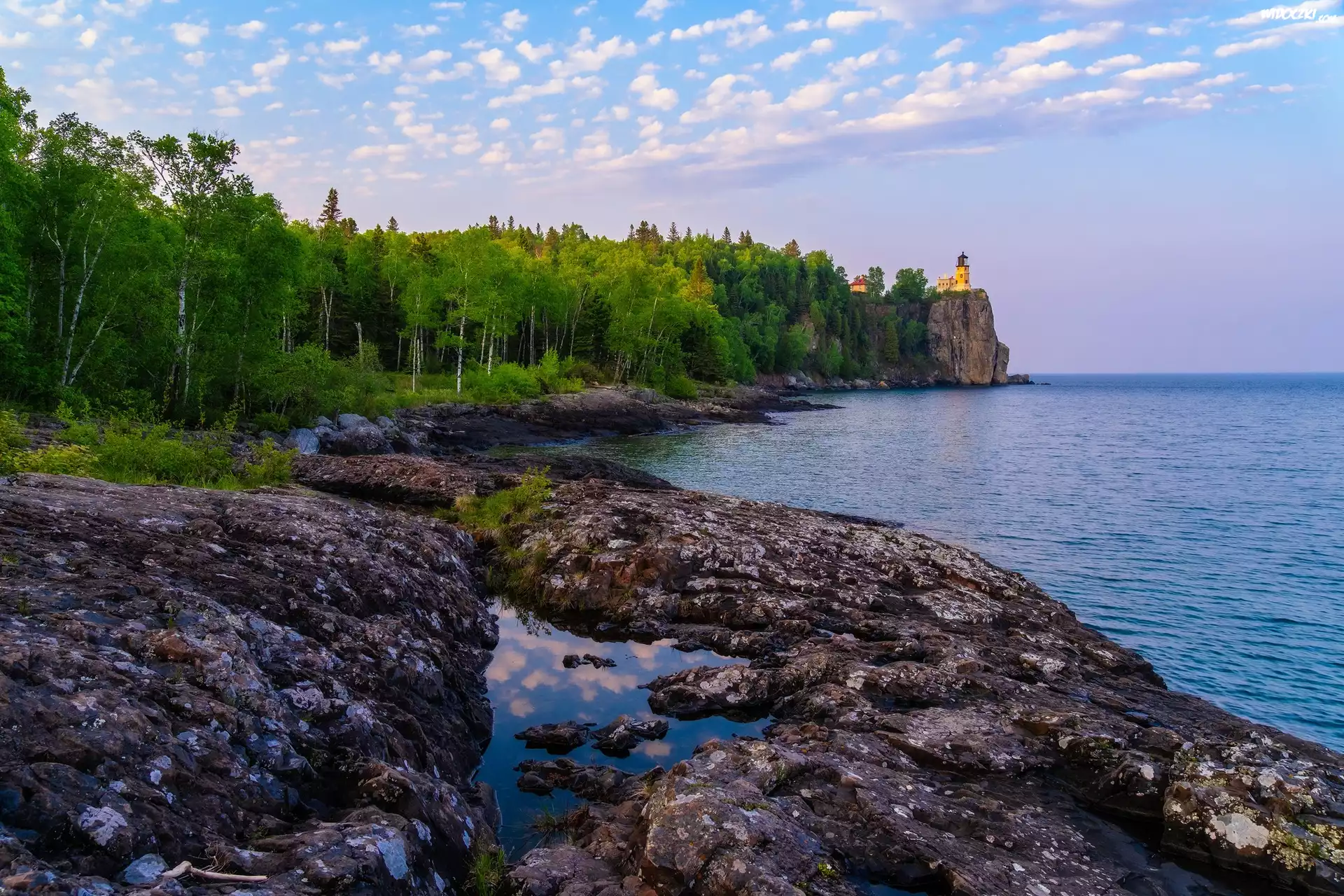 Stany Zjednoczone, Stan Minnesota, Jezioro, Upper Lake, Latarnia morska, Split Rock, Wybrzeże, Skały, Klif, Drzewa |