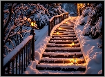 Zima, Ośnieżone, Schody, Latarnie, Grafika AI