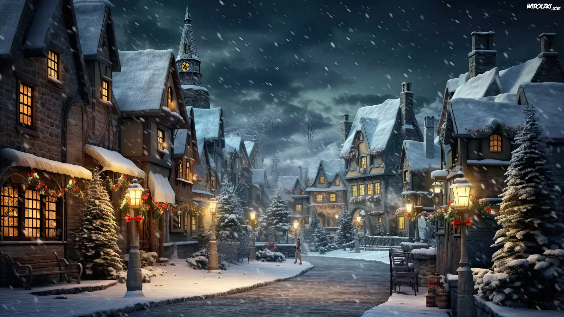 Zima, Śnieg, Miasto, Domy, Światła, Ulica, Latarnie, Choinki, Noc, Boże Narodzenie