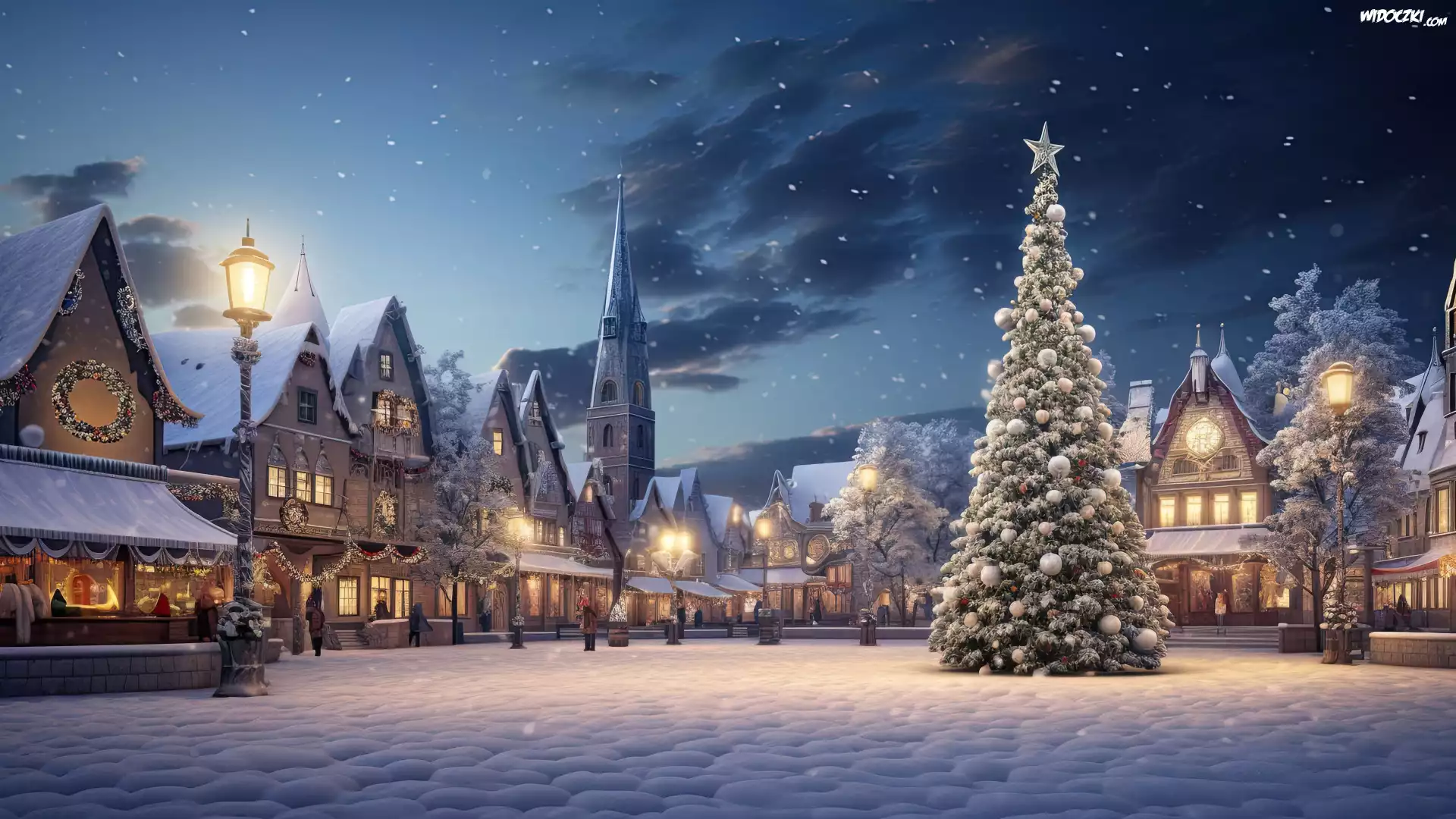 Zima, Noc, Miasteczko, Wieża, Domy, Światła, Rynek, Choinka, Śnieg, Latarnie, Boże Narodzenie