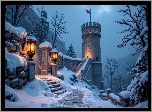 Zima, Latarnie, Schody, Śnieg, Wieża