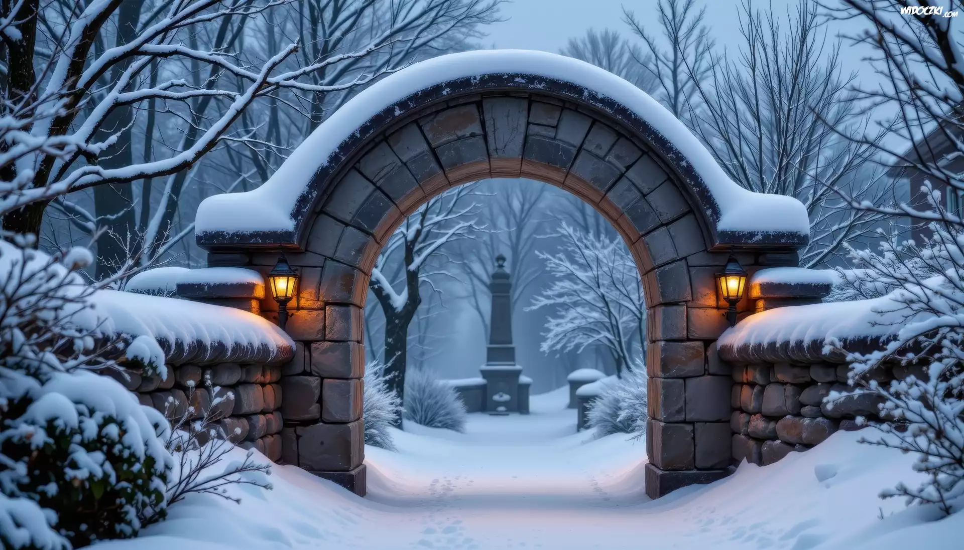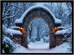 Zima, Kamienny, Łuk, Latarnie, Śnieg, Zima