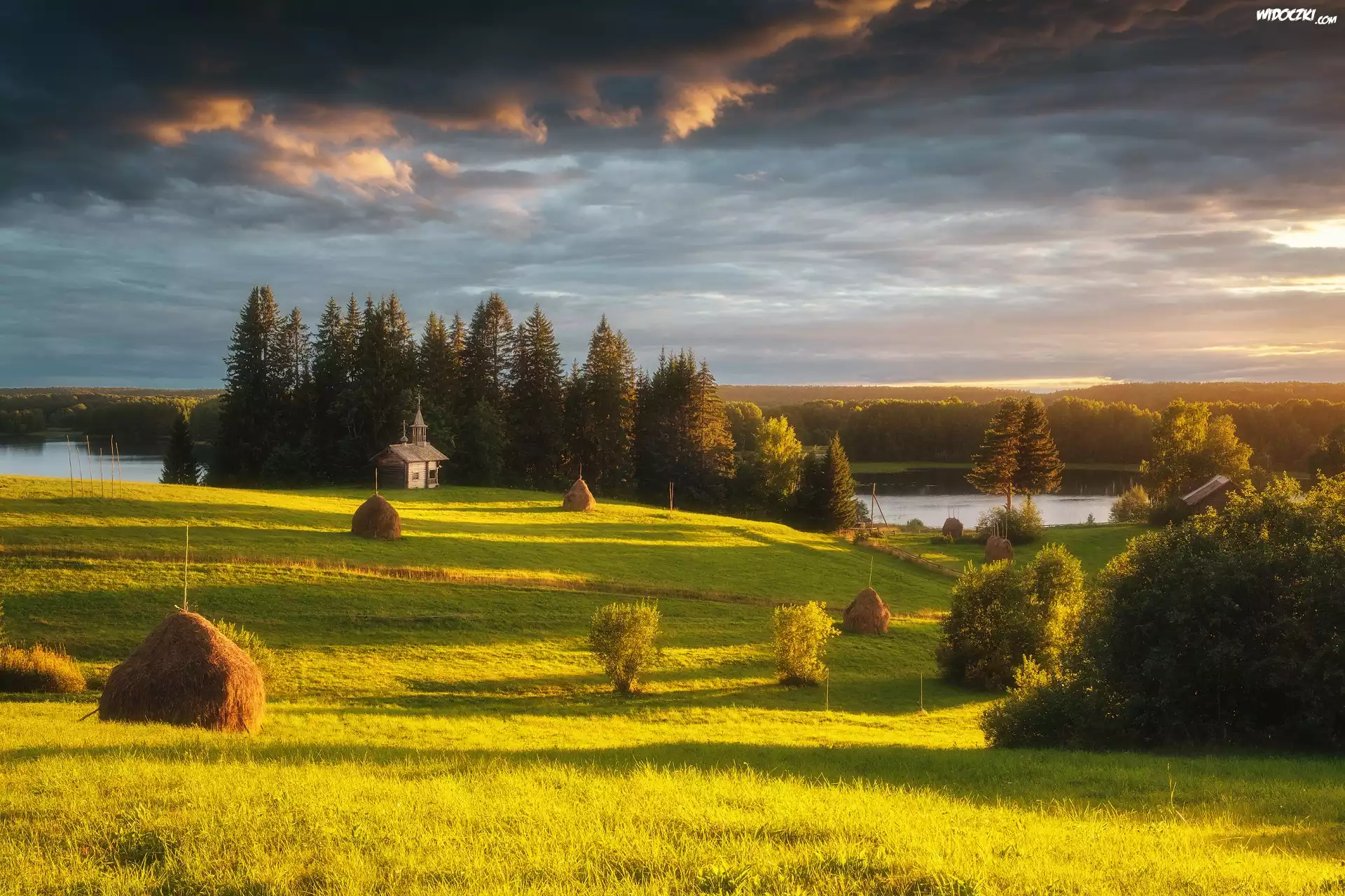 Lato, Pole, Stogi, Siana, Kapliczka, Drzewa, Las, Jezioro Kenozero Chmury, Zachód słońca, Wieś, Kienoziero, Obwód archangielski, Rosja |