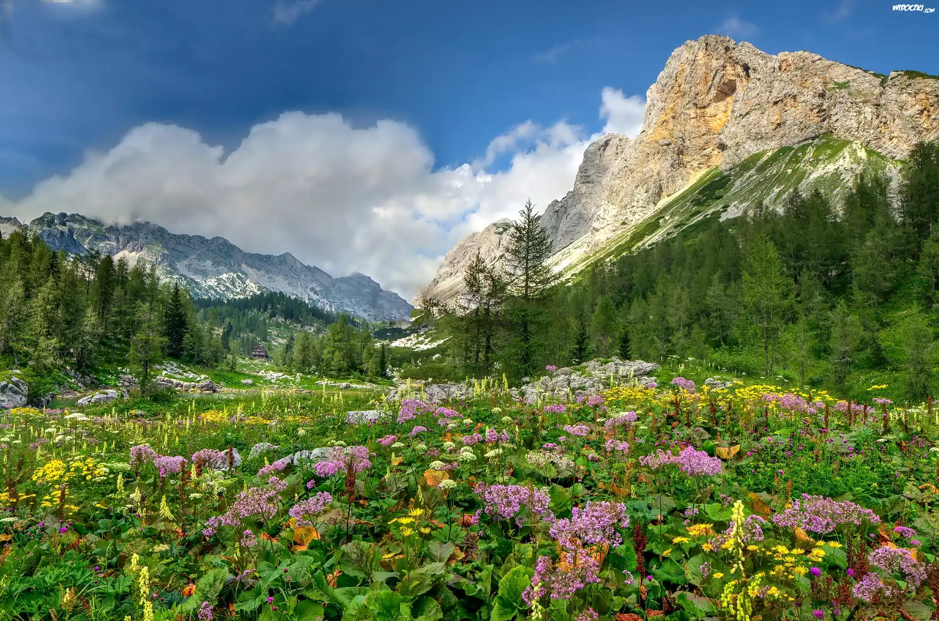 Zdjęcia, Lato, Góry, Świerki, Chmury, Kwiaty