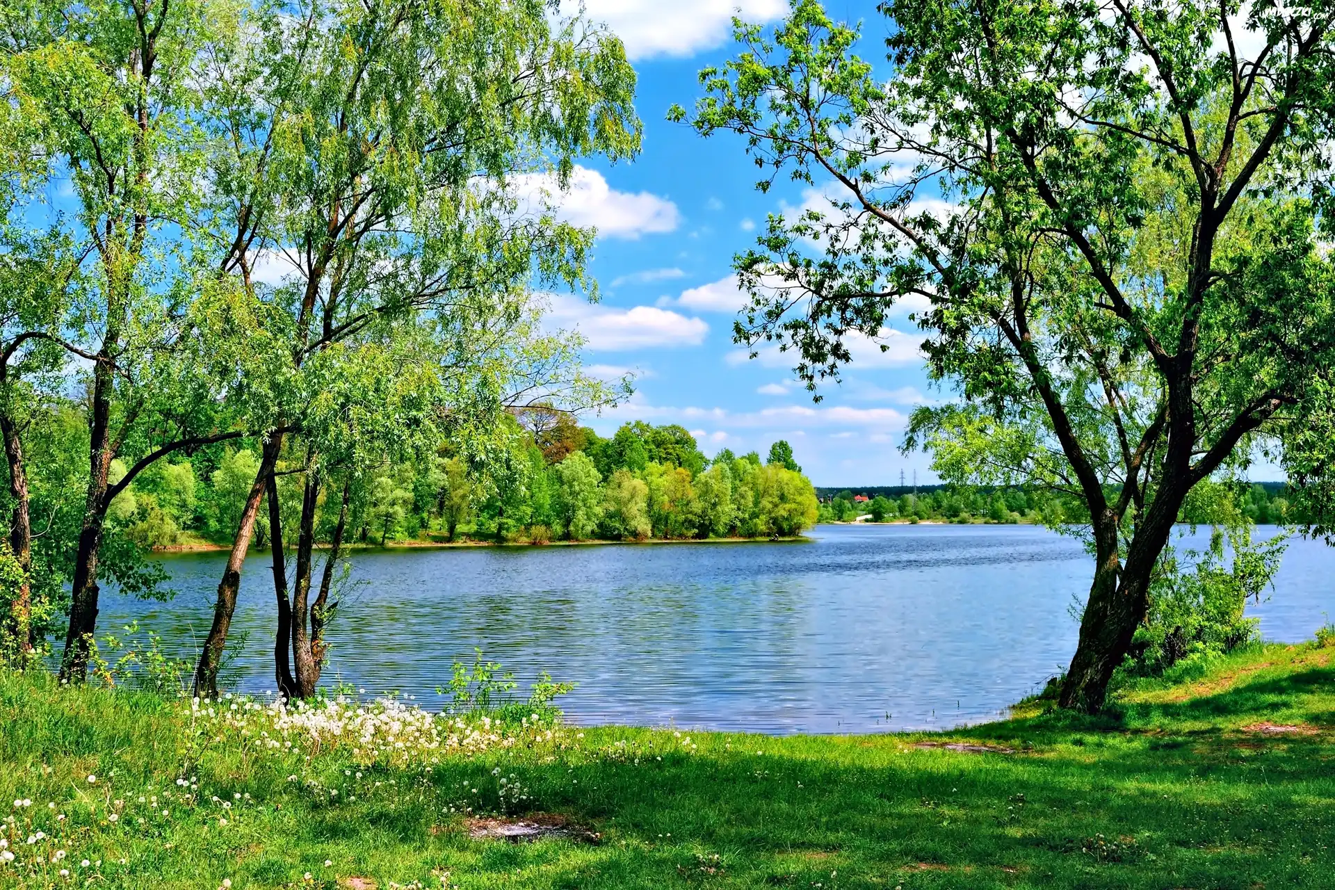 Zdjęcia, Lato, Jezioro, Drzewa, Trawa