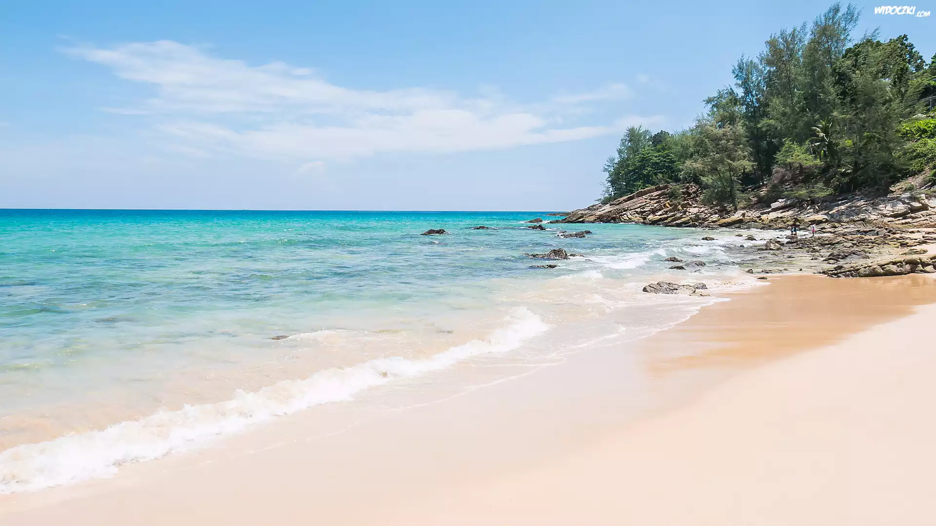 Zdjęcia, Lato, Plaża, Kamienie, Morze, Kamienie, Skała, Drzewa, Niebo, Tropiki