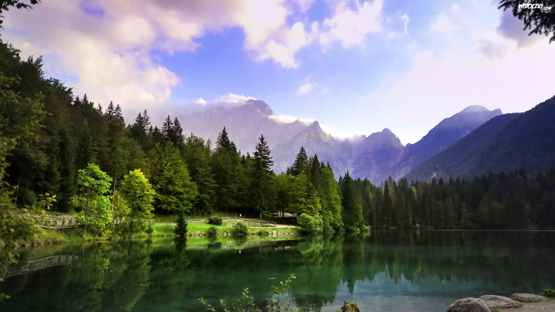 Jezioro, Las, Drzewo, Góra, Kamień, Niebo, Obłok, Lato