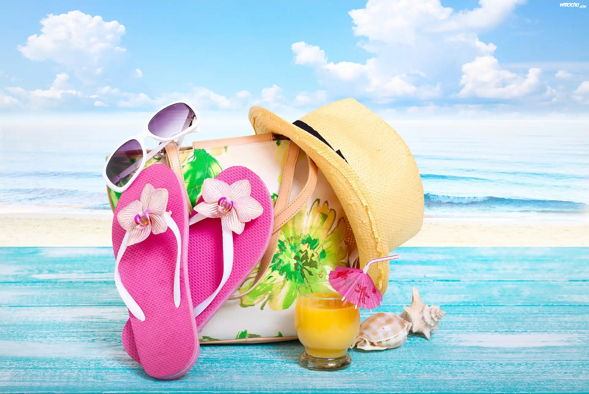Zdjęcia, Lato, Morze, Klapki, Okulary, Kapelusz, Drink, Wakacje