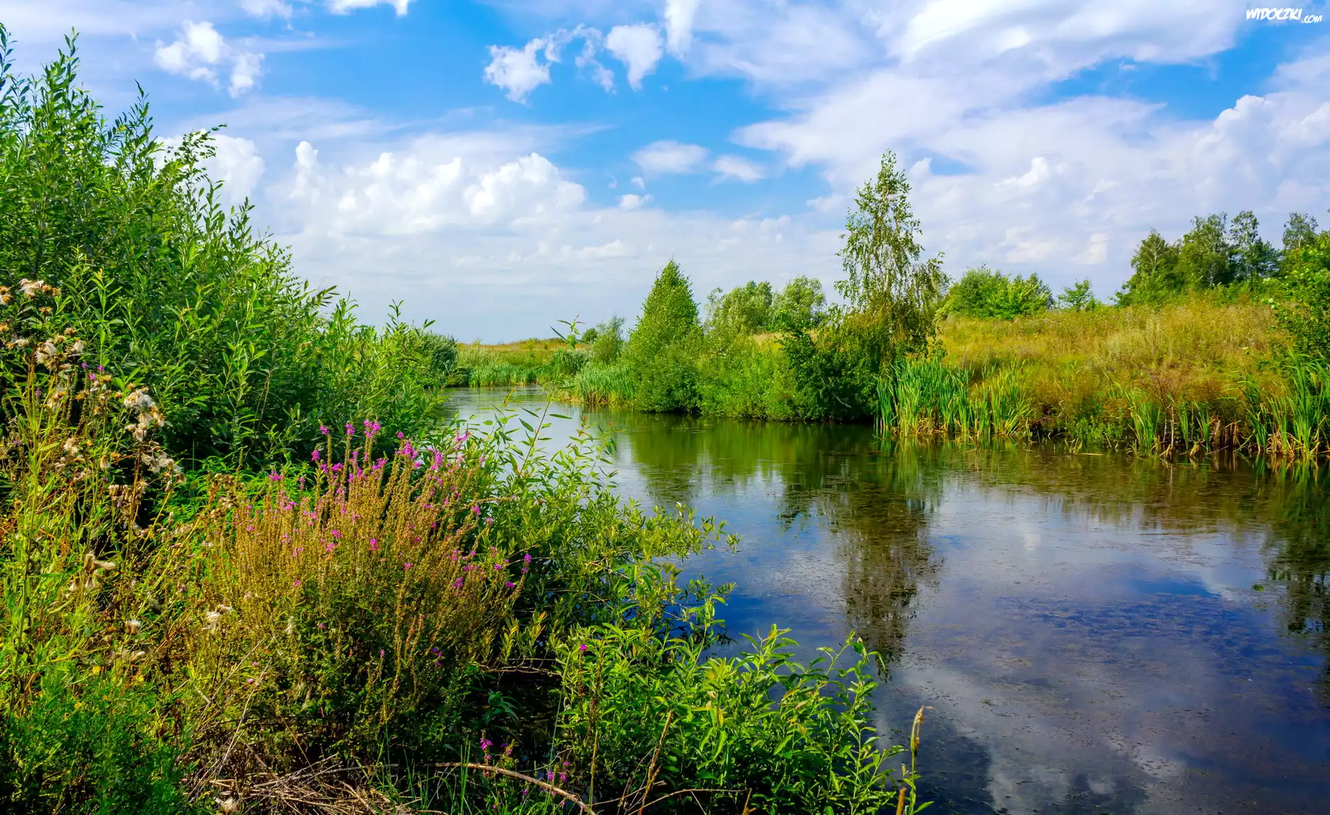 Lato, Rzeka, Drzewa, Kwiaty, Rośliny