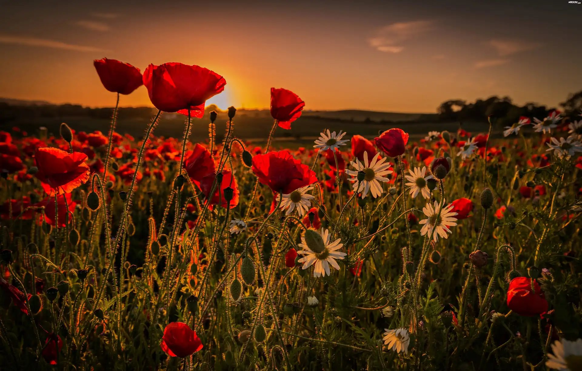 Lato, Łąka, Zachód, Słońca, Maki, Rumianki
