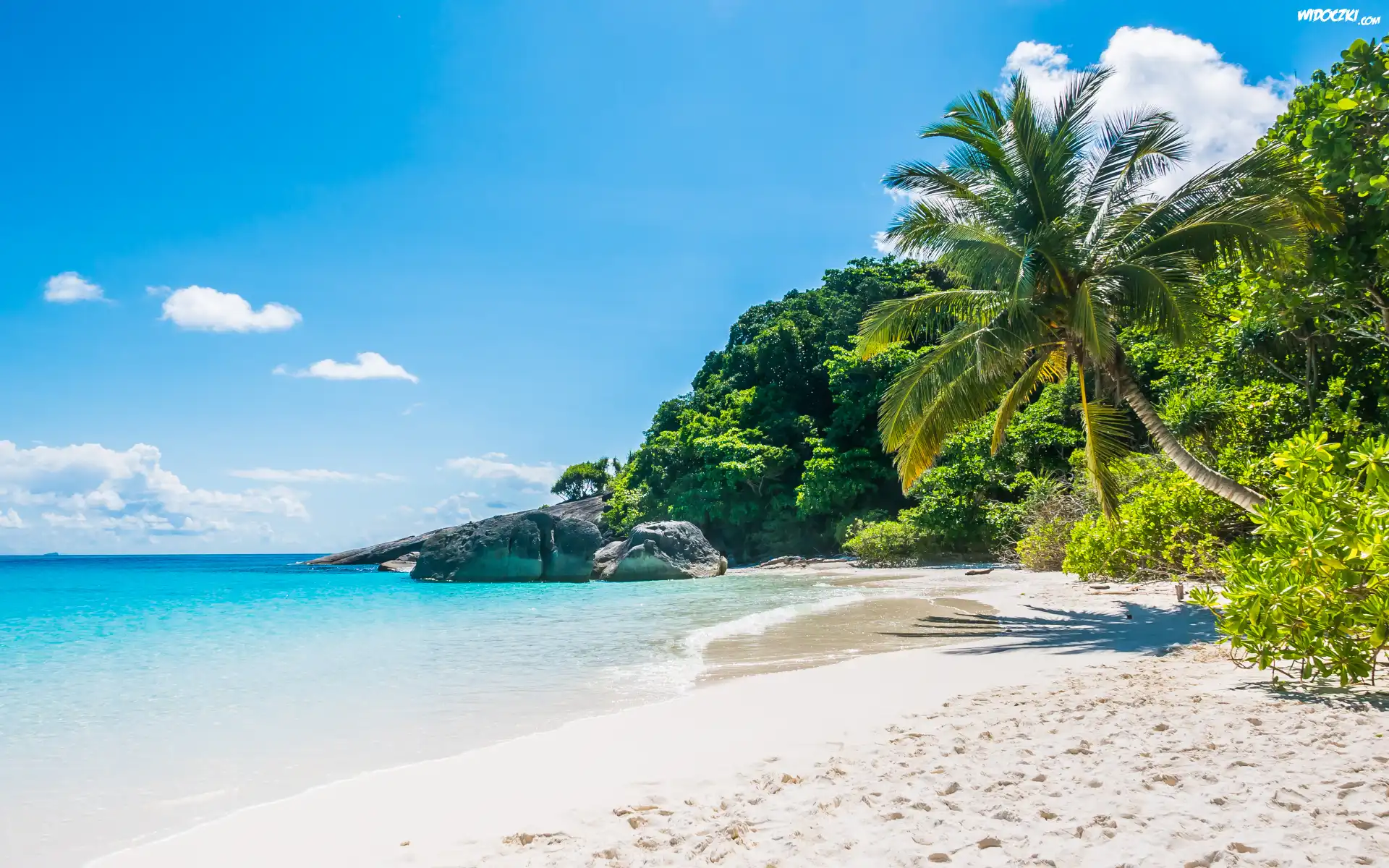 Zdjęcia, Lato, Morze, Plaza, Biały, Piasek, Palmy, Skały, Niebo, Obłoki, Roślinność
