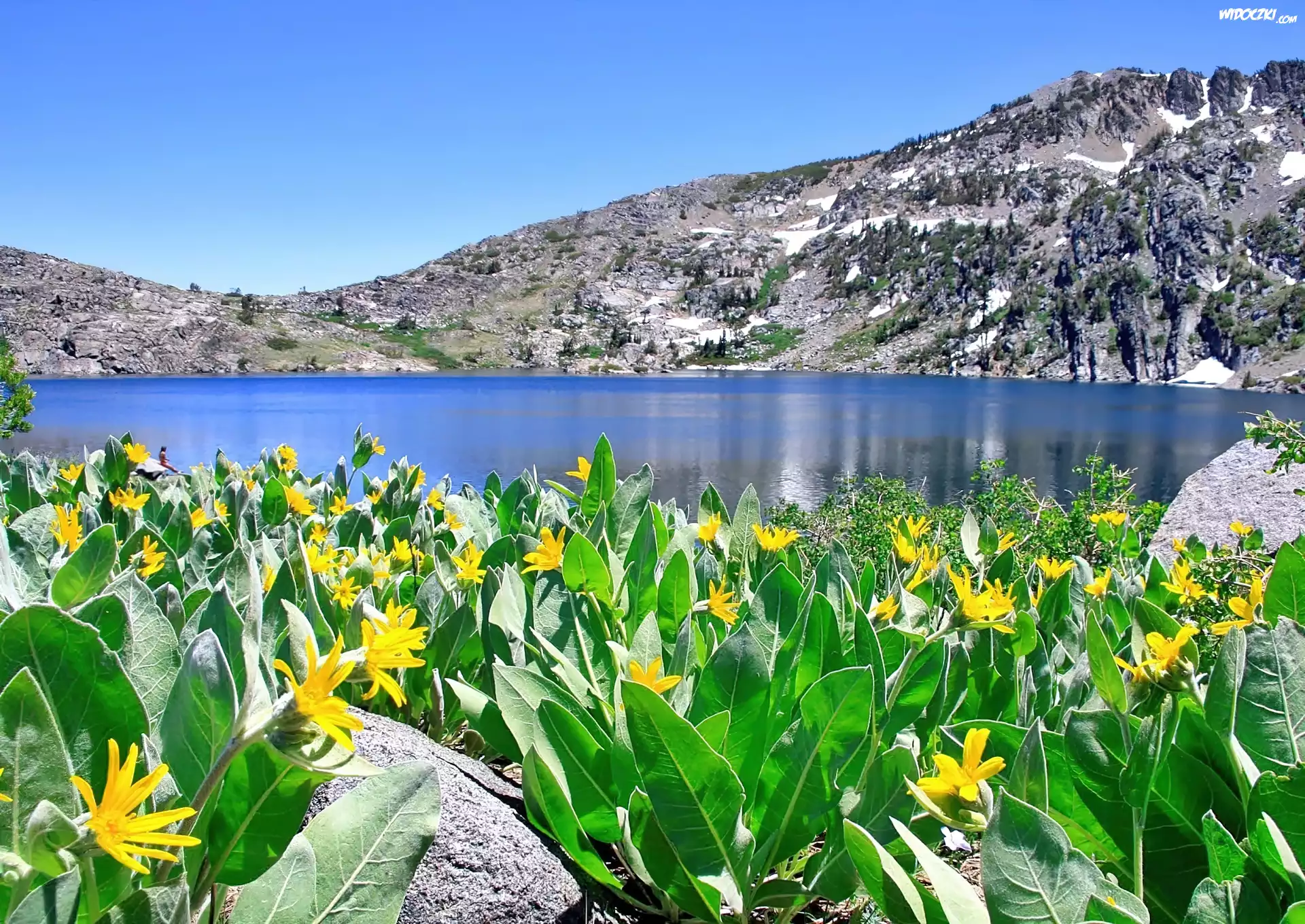 Zdjęcia, Lato, Góry, Jezioro, Głazy, Żółte, Kwiaty