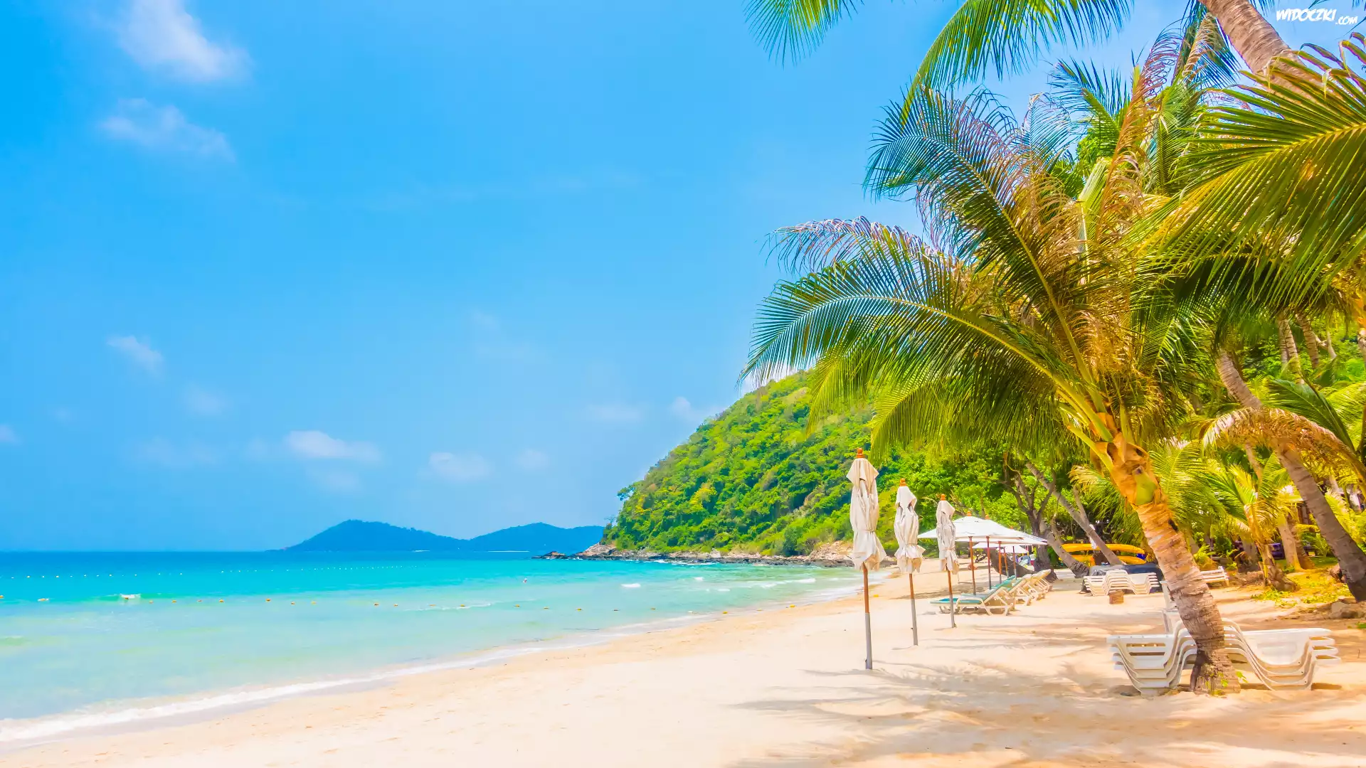 Zdjęcia, Lato, Wybrzeże, Plaża, Morze, Leżaki, Parasole, Wzgórza, Roślinność, Palmy, Niebo