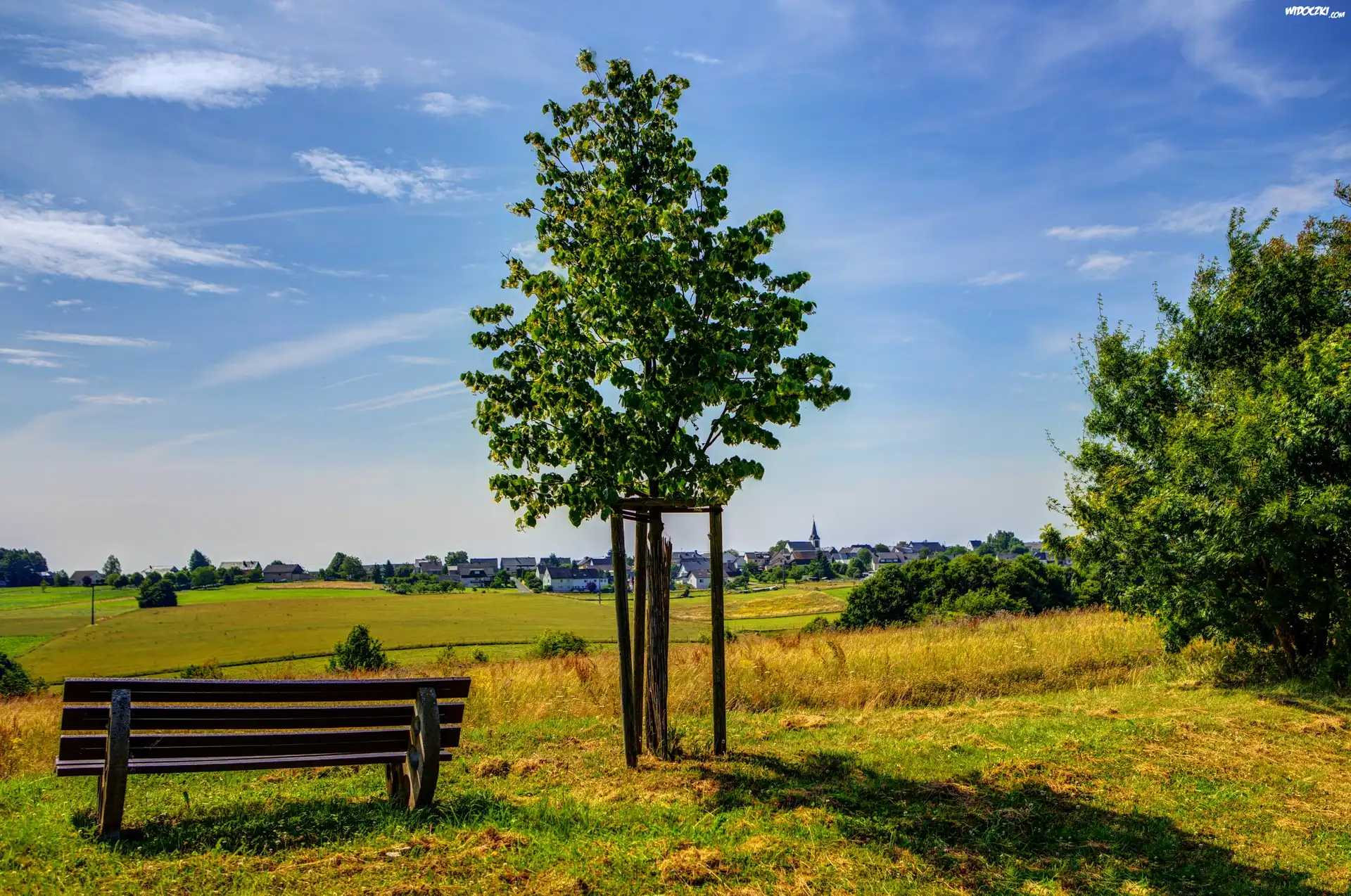 Zdjęcia, Lato, Ławka, Drzewo, Wioska, W, Tle
