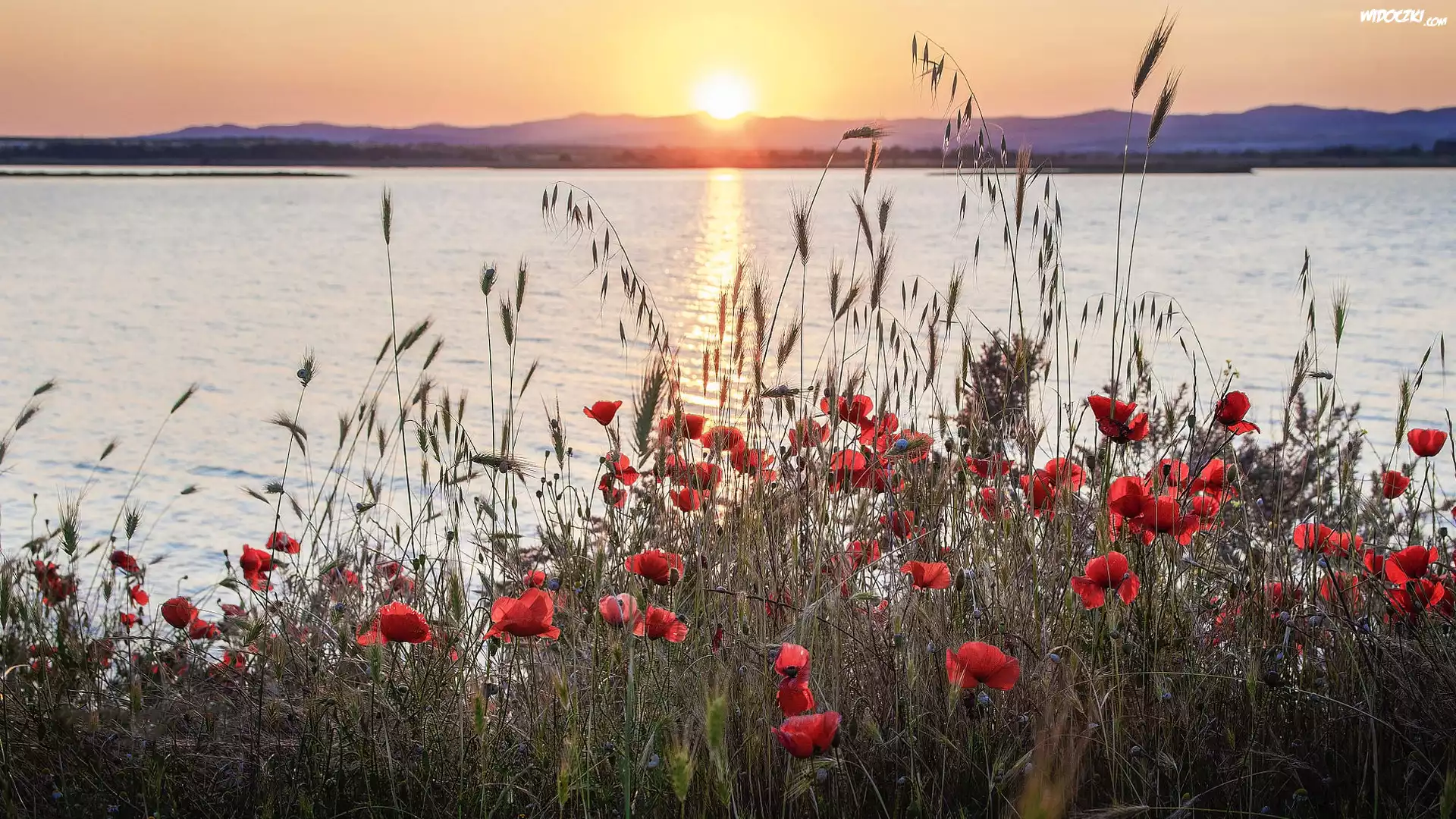 Lato, Góry, Jezioro, Kwiaty, Maki, Świt, Brzeg, Zboże, Wschód słońca
