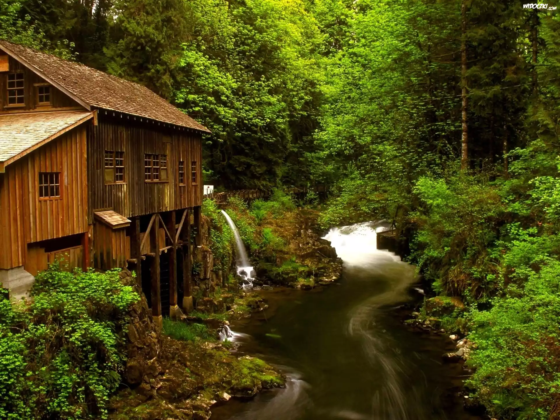 Zdjęcia, Lato, Las, Rzeka, Zabudowania, Szopa