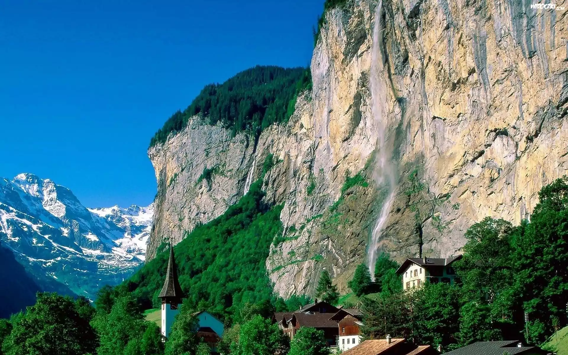 Zdjęcia, Lauterbrunnen, Góry, Las, Wodospad, Kościół, Domy