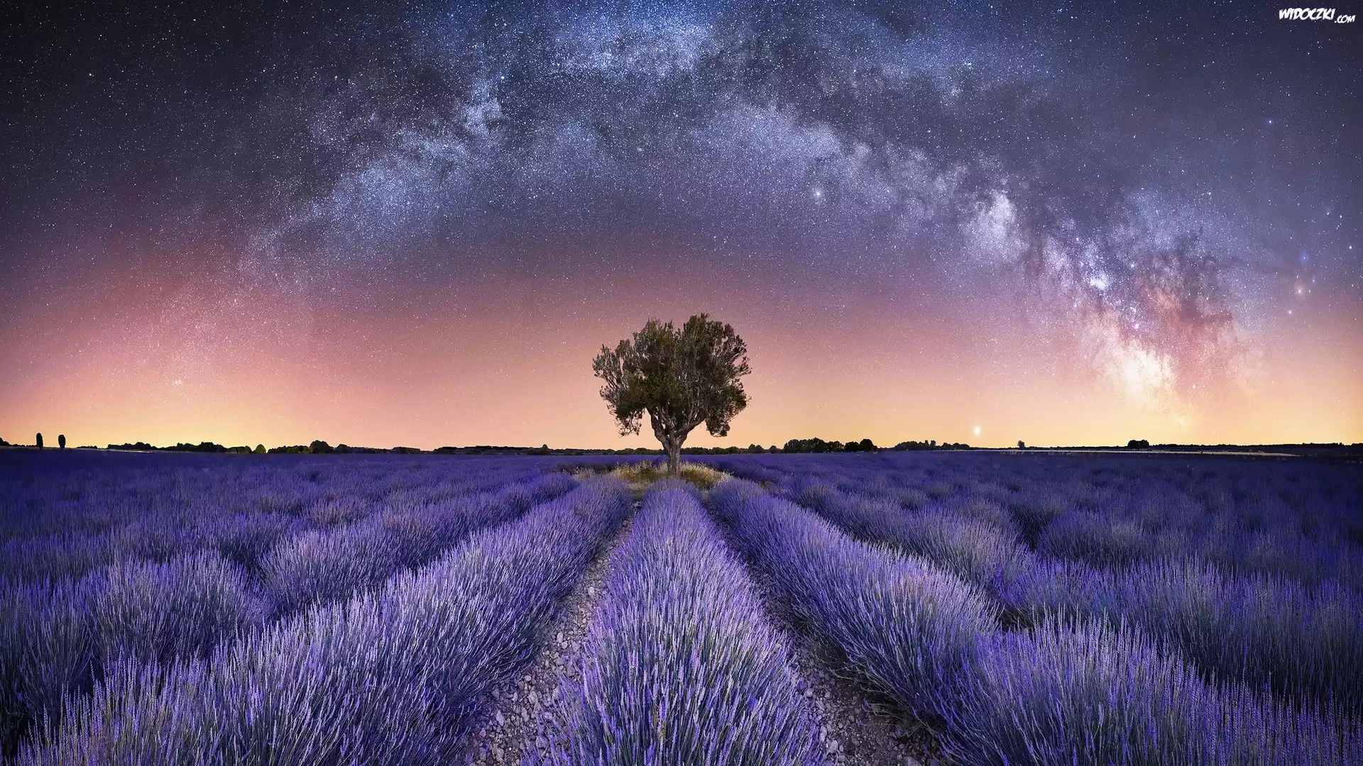 Zdjęcia, Pole, Lawenda, Drzewo, Droga Mleczna