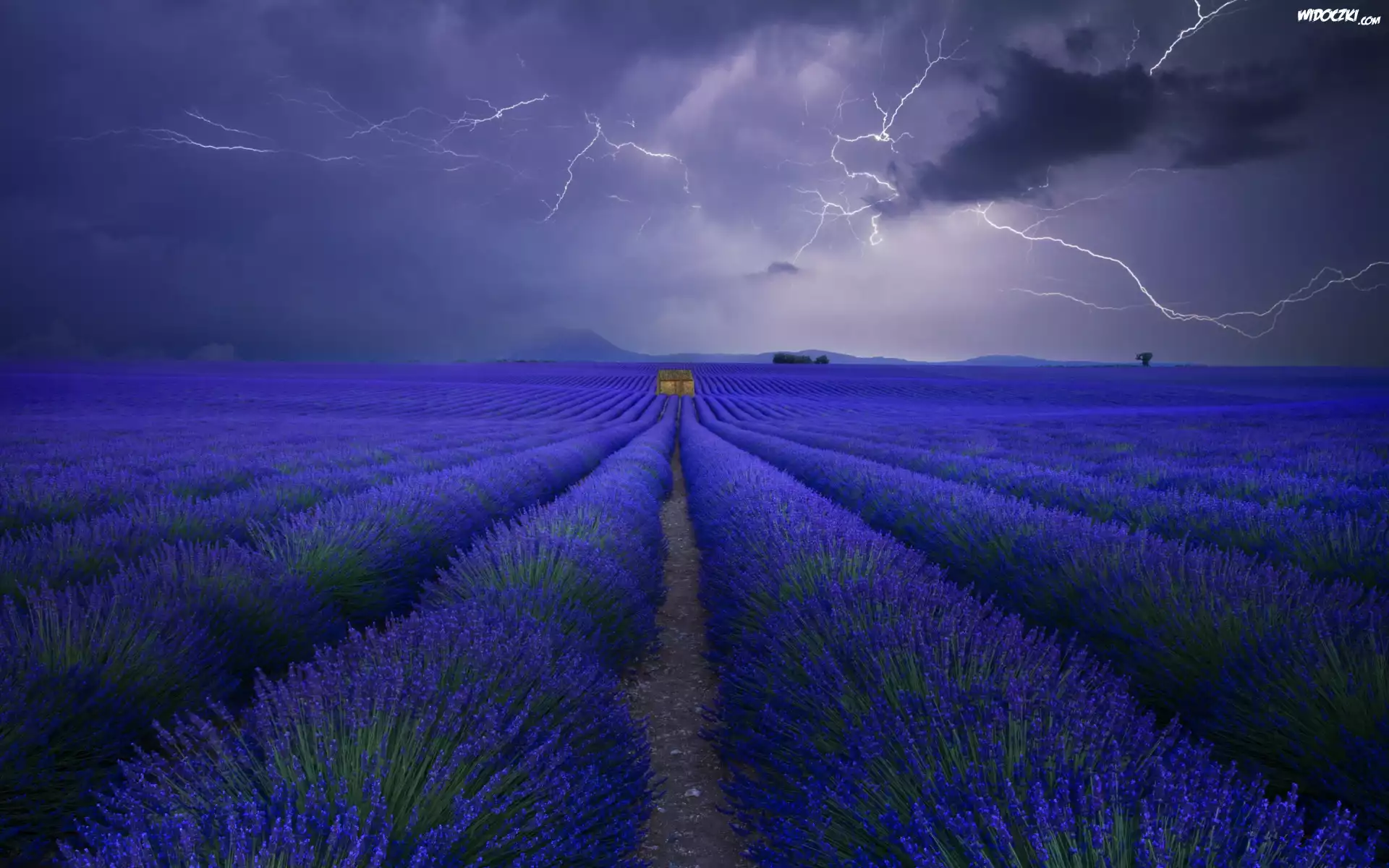 Pole, Lawenda, Dom, Wieczór, Niebo, Chmury, Pioruny