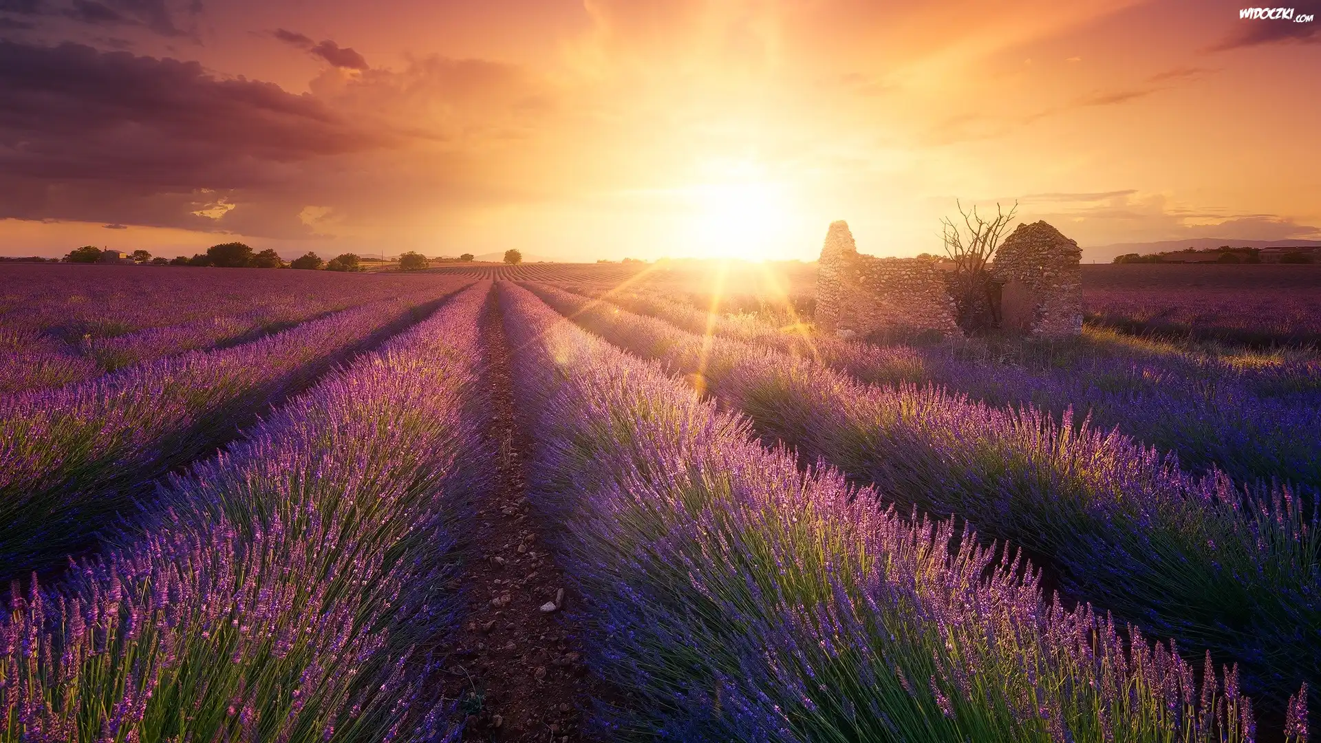 Zdjęcia, Pole, Lawenda, Drzewa, Ruina, Wschód słońca, Promienie słońca