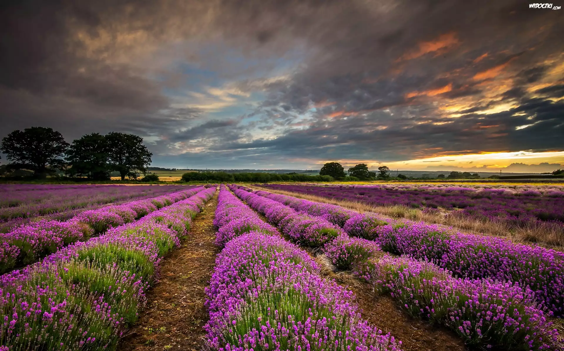 Lawendowe, Pole, Niebo, Chmury, Drzewa