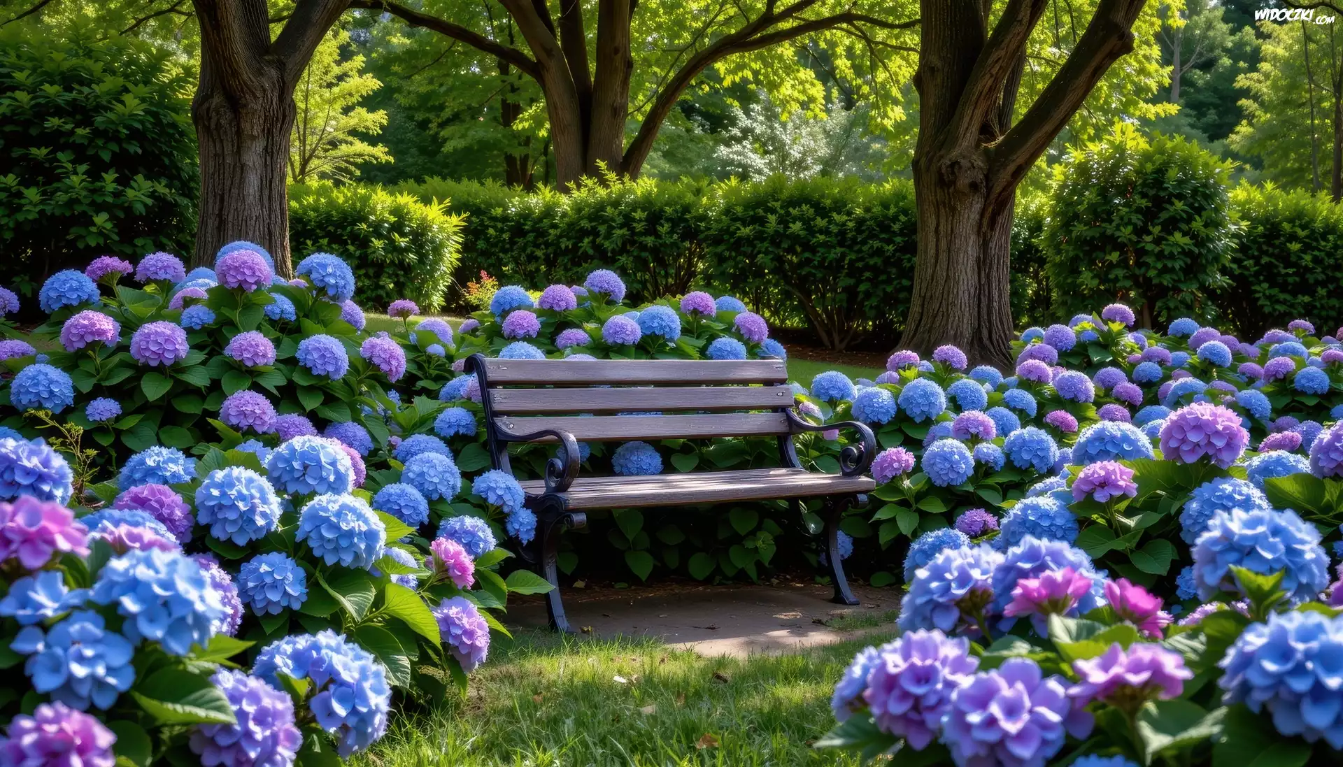 Hortensje, Różowe, Niebieskie, Ławka, Park, Drzewa