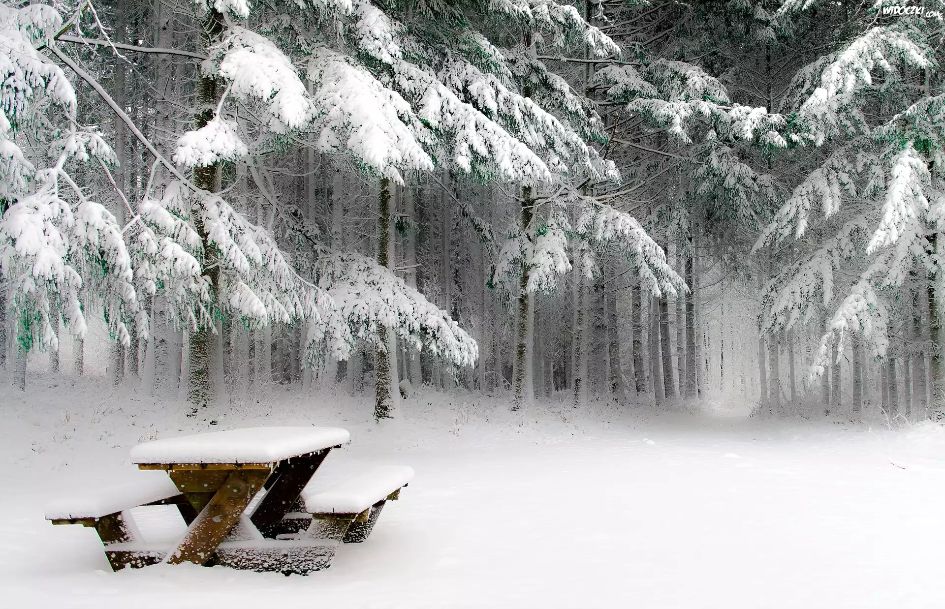 Zima, Las, Śnieg, Ławka piknikowa, Drzewa