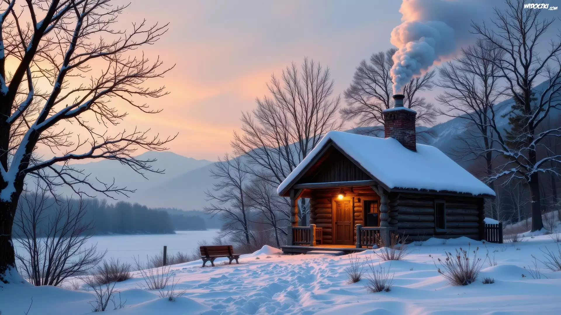 Zdjęcia, Zima, Dom, Dym, Ławka, Drzewa, Góry, Śnieg