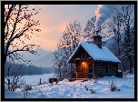 Zima, Dom, Dym, Ławka, Drzewa, Góry, Śnieg